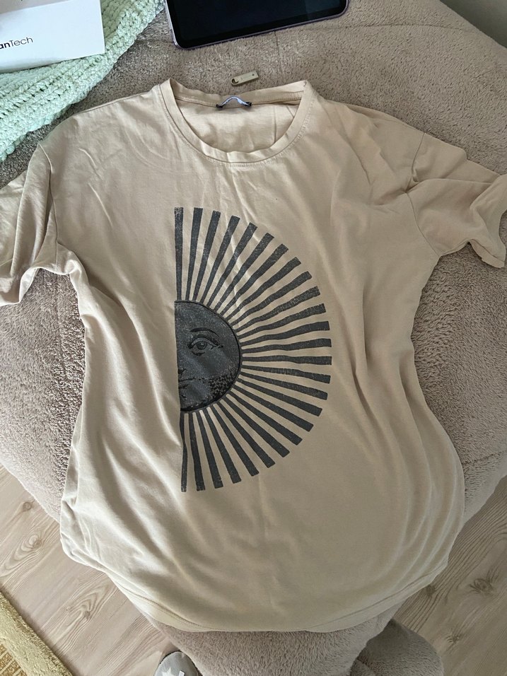 Bej renkli, rahat kesim u ve baskılı güneş-ay deseniyle. Yumuşak keten kumaştan, gündelik sokak tarzı için uygun, kolay şıklık sunar.