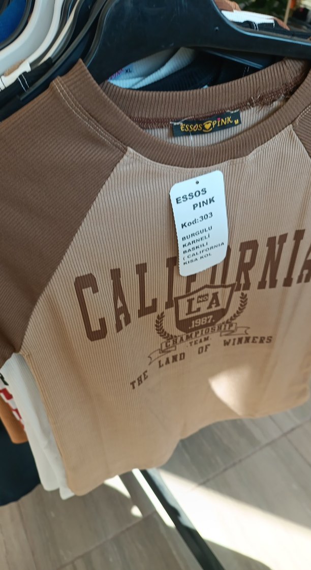 Bej renkli, kısa kollu ve yuvarlak yakalı tişört. California baskılı, günlük kullanıma uygun.