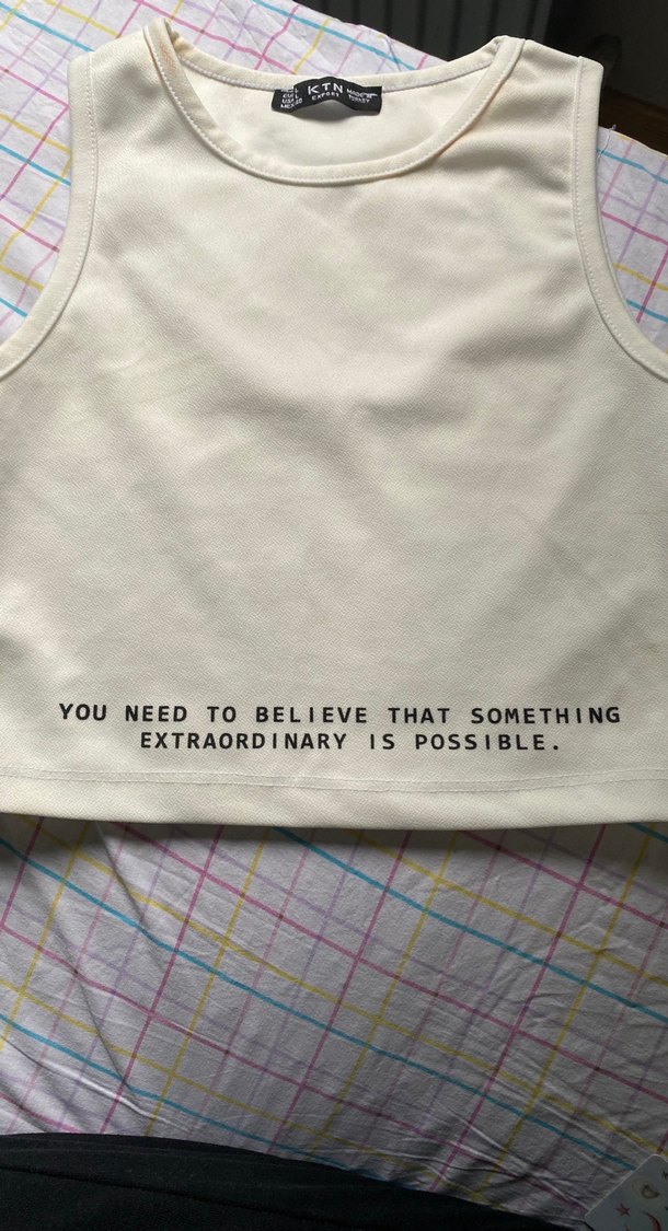 Pastel bej renginde, kolsuz ve yuvarlak yakalı bol kesim Yumuşak sentetik kumaştan, üzerinde 'You need to believe that something extraordinary is possible.' yazılı baskı bulunur. Günlük kullanım için uygundur.