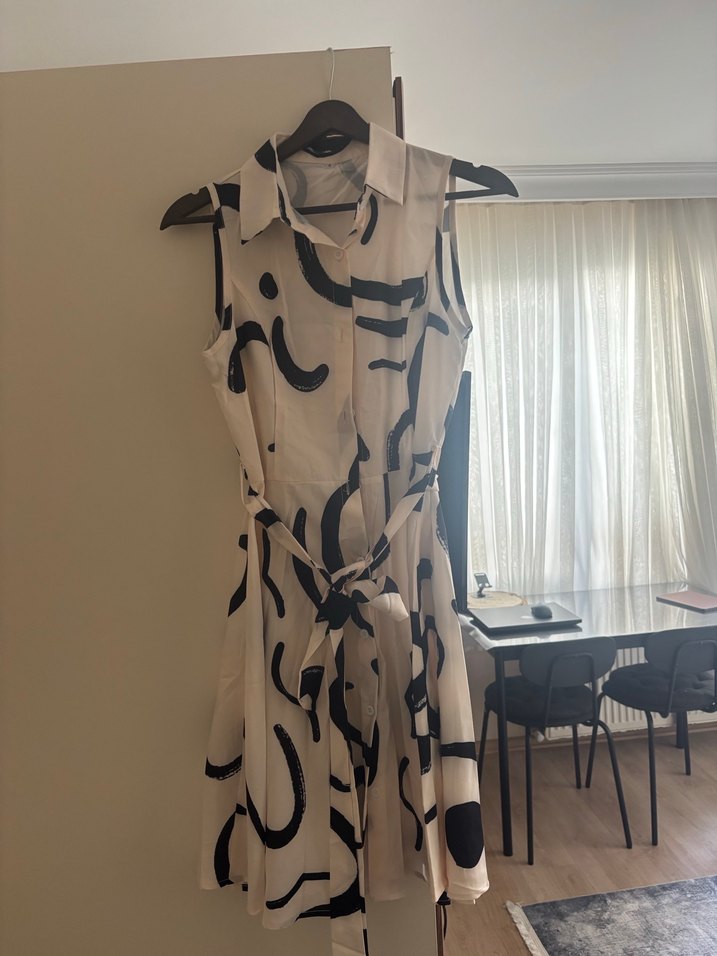 Kolsuz, keten elbise; fitted kesim, halter yaka ve drapeli tasarıma sahip. Bej kumaş üzerinde gri soyut baskılar var. Günlük kullanıma uygun çağdaş Paris tarzı.