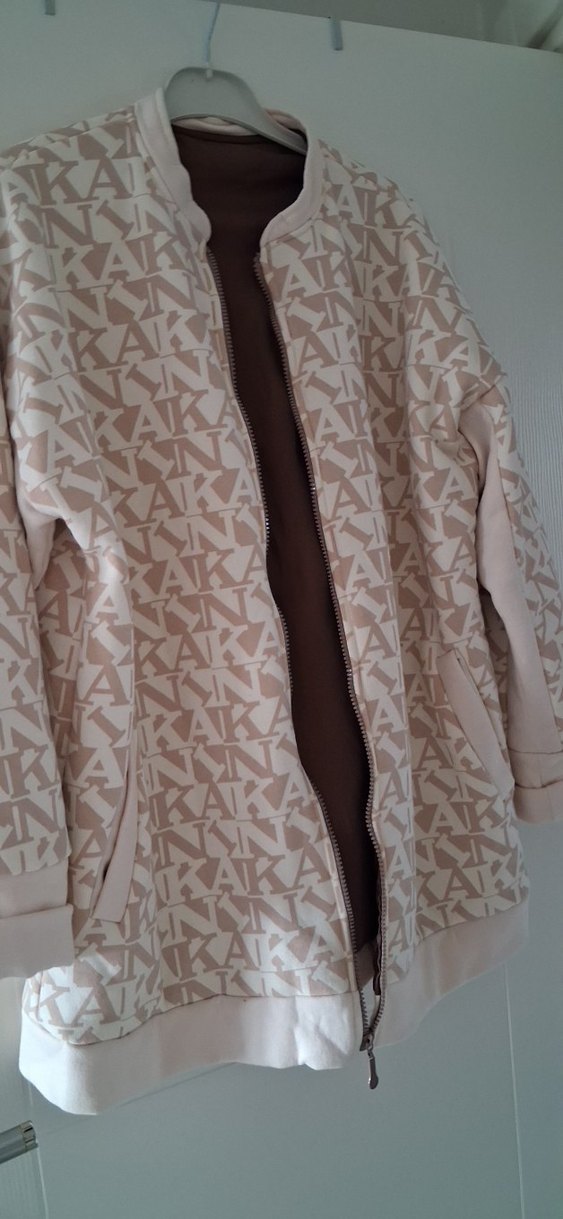 Bej baskılı midi hamile ceketi, notlu yaka ve uzun kolludur. Rahat kesimi ve fermuarlı önü ile günlük sokak stili için uygundur. 73cm uzunluğunda 48bedene kadr olur