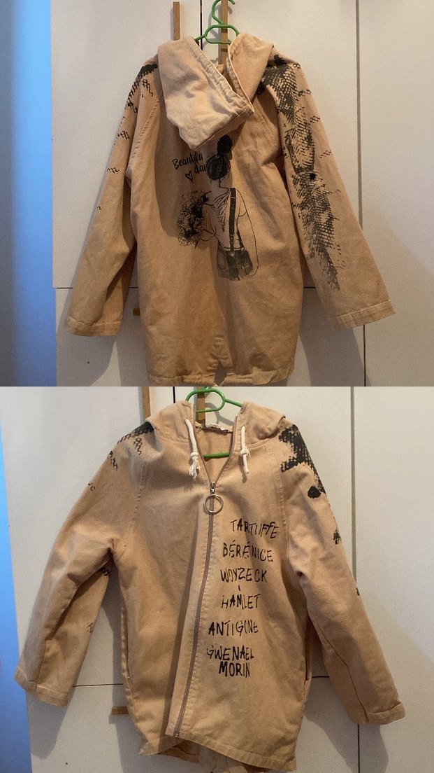 Bej renkli, baskılı midi uzunlukta, bol kesim kadın ceket. Uzun kollu, yakası kesik ve düğmeli. Kapüşonlu, günlük kullanım için uygun.