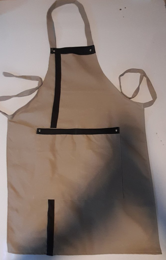 Bej renkli, baskılı ve gri detaylı mutfak önlüğü, ayarlanabilir boyun ve bel bağcıkları ile rahat kullanım sağlar.