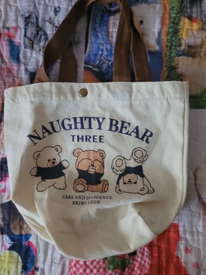 Bej renkli, pamuk kumaştan yapılmış, baskılı sevimli ayıcık desenli ve tokalı askılı kadın çantası.