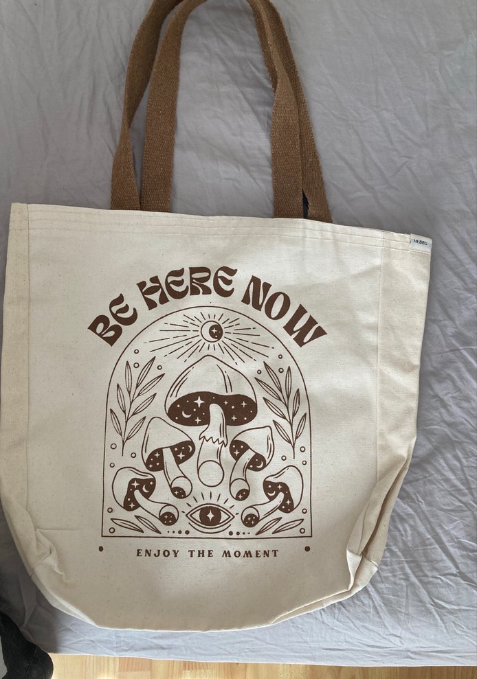 Bej renkli pamuklu bohem tarzda baskılı kadın çanta, fermuarlı kapanışlı. Üzerinde 'ENJOY THE MOMENT, NOW' yazısı bulunur.