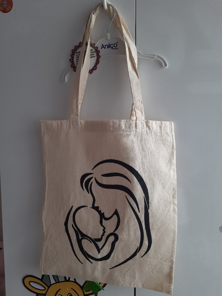 Bej pamuklu çanta, annelik temalı baskısı ve sade tasarımıyla günlük kullanıma uygundur. Anico markalıdır.