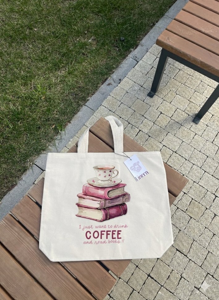 Bej pamuklu kadın çanta, baskılı kitap ve kahve fincanı deseniyle bohem ve rahat bir tarz sunar. Üzerinde 'COFFEE' yazısı bulunur. ☕