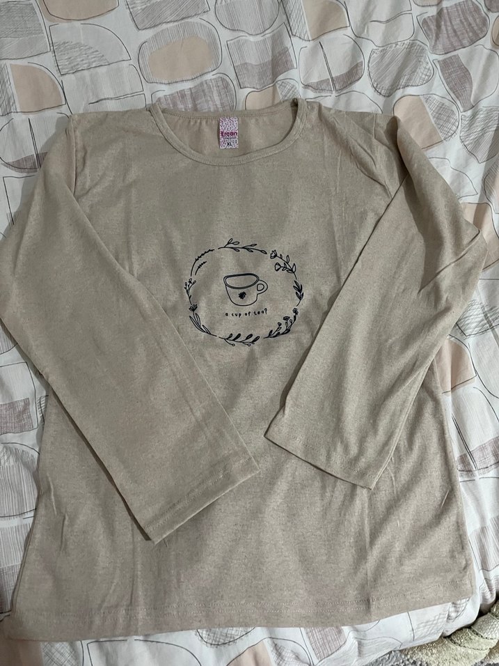 Bej Baskılı Pamuklu Uzun Kollu Gecelik