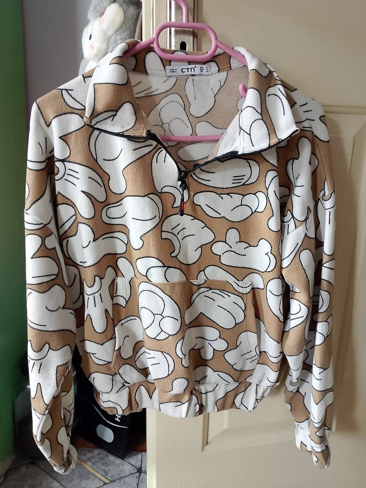 Uzun kollu, düğmeli, baskılı ve rahat kesim bej sweat, yumuşak ve sıcak kumaştan, günlük rahat sokak stili için uygundur. S bedendir