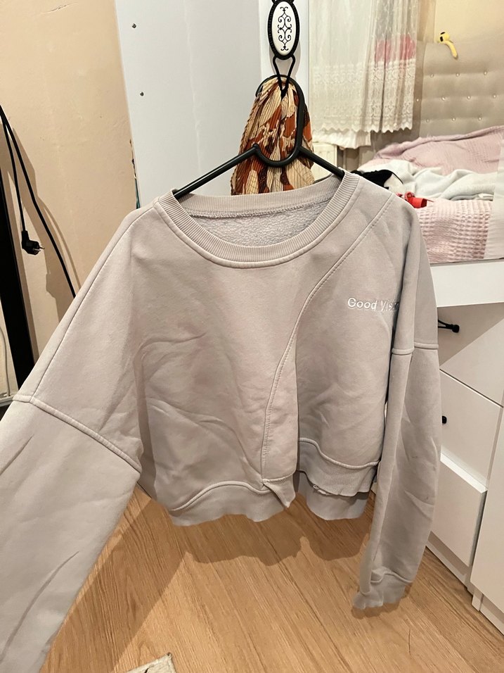 Bej renkli, uzun kollu, rahat kesim kadın sweatshirtü. Keten kumaştan üretilmiş, baskılı deseni ve günlük sokak stili yer alır.