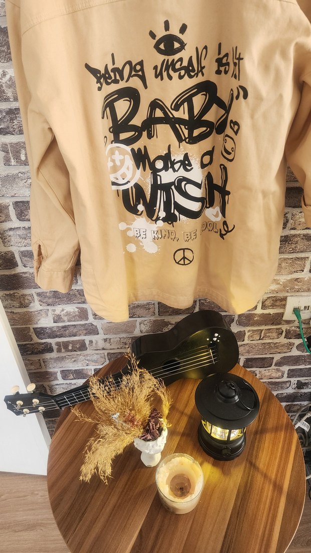 Yumuşak pamuklu, bej renkli, baskılı ve düğmeli uzun kollu bol kesim kadın kot ceket Yuvarlak yaka ve 'WISH' yazısı içerir.