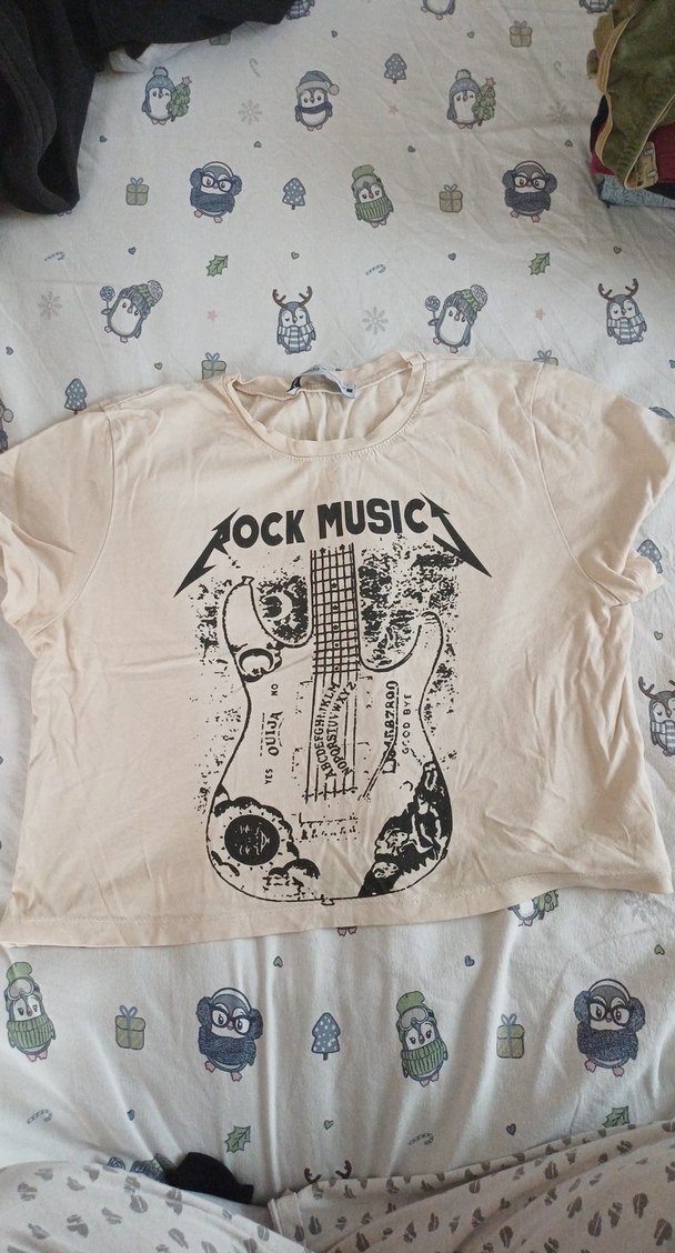 Bej renginde, pamuklu, baskılı elektrik gitar ve 'OCK MUSIC' yazılı bol kesim tişört. Kısa kollu, yuvarlak yaka, günlük kullanıma uygun.Ürün gayet iyi durumdadır.Markası Fulla dır.