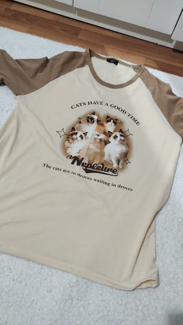 Bej renkli, baskılı kedi figürlü sokak stili uzun kollu rahat kedi kıyafeti.