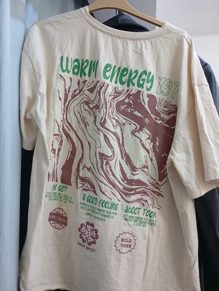 Pamuk kumaştan, kısa kollu, bej renkli baskılı tişört. Salaş kesim ve sokak stiline uygun, günlük dış mekan kullanımı için ideal. ✨