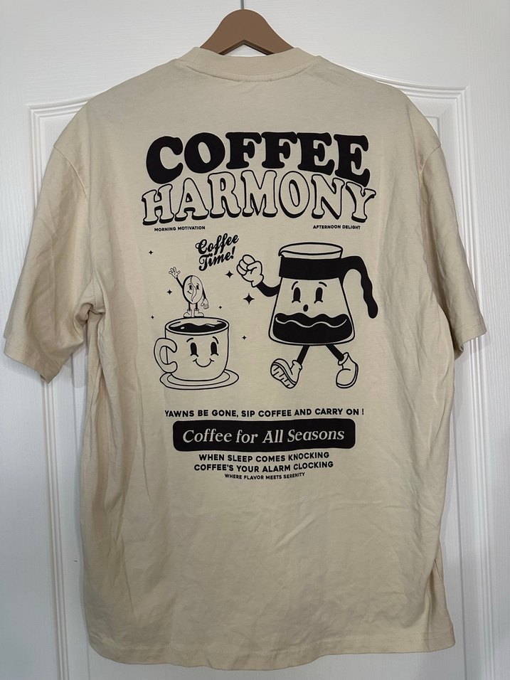 Bej renkte, pamuk kumaştan, kısa kollu ve rahat kesimtişörtü. Üzerinde kahve temalı baskılar ve 'Coffee Harmony', 'Coffee for All Seasons' yazıları bulunur. Günlük rahat kullanım için uygundur. ☕