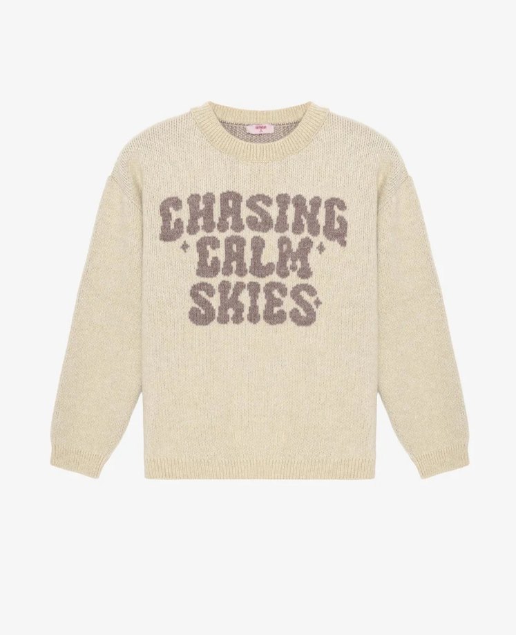 Bej renkli, bol kesim ve uzun kollu triko kız kazak. Ön kısmında "CHASING CALM SKIES" baskısı bulunur. Yuvarlak yaka ve günlük sokak stili için uygundur. ️