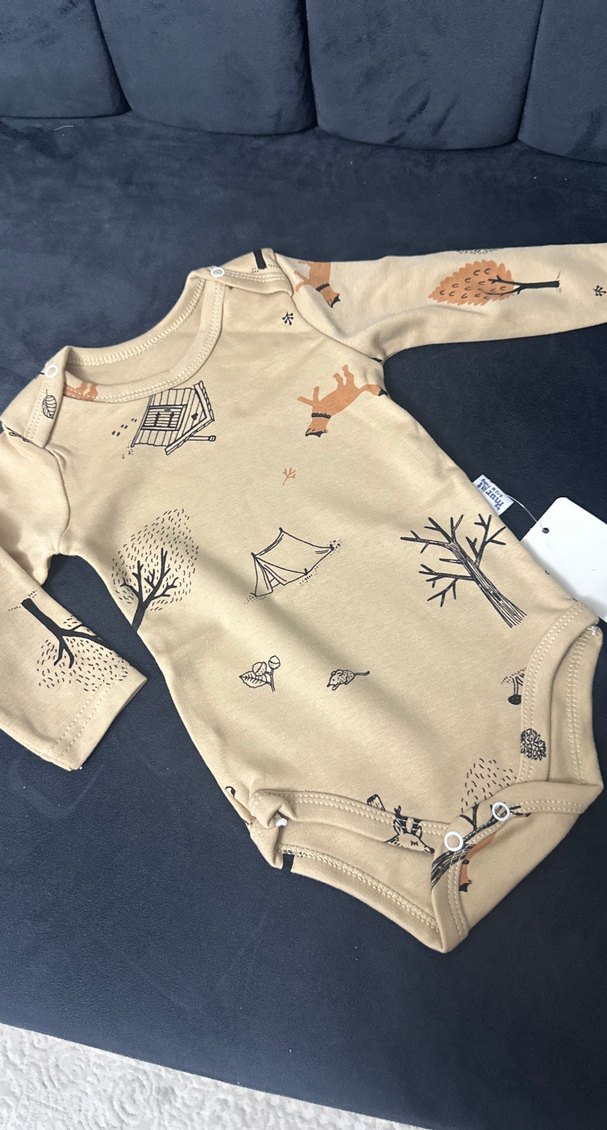 Bej renkte, uzun kollu, bisiklet yaka ve baskılı desenli pamuklu örgü bebek body. Rahat ve şık sokak stili sunar. Pamuklu kumaş elimdeki bedenler adet fiyatıdır 0-3m 3-6 m 6-9 m 9-12 m