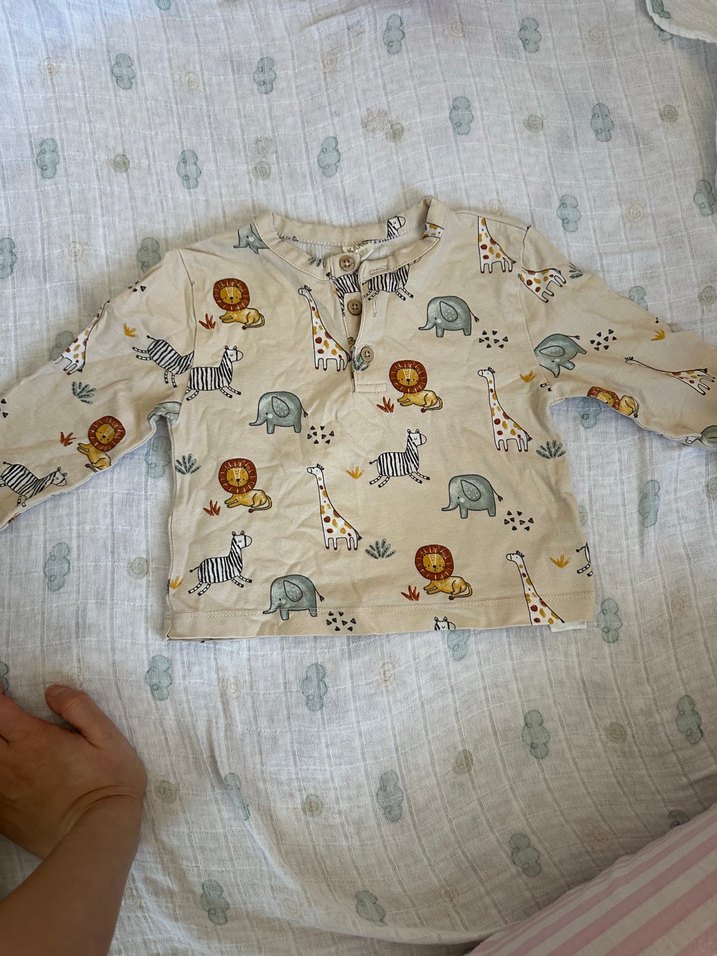 Bej renkli, uzun kollu ve düğmeli erkek çocuk gömleği. Aslan, zebra, zürafa ve fil desenleriyle hareketli. Yumuşak kumaş ve bol kesimlidir.