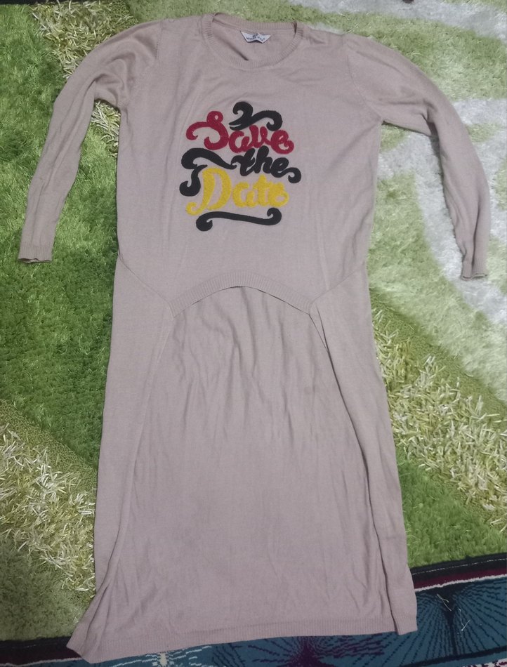 Bej renkte, uzun kollu ve yuvarlak yakalı kazak ke Renkli baskı Günlük kullanıma uygun. herhangi bir deformesi yok ihtiyaç fazlası satıyorum