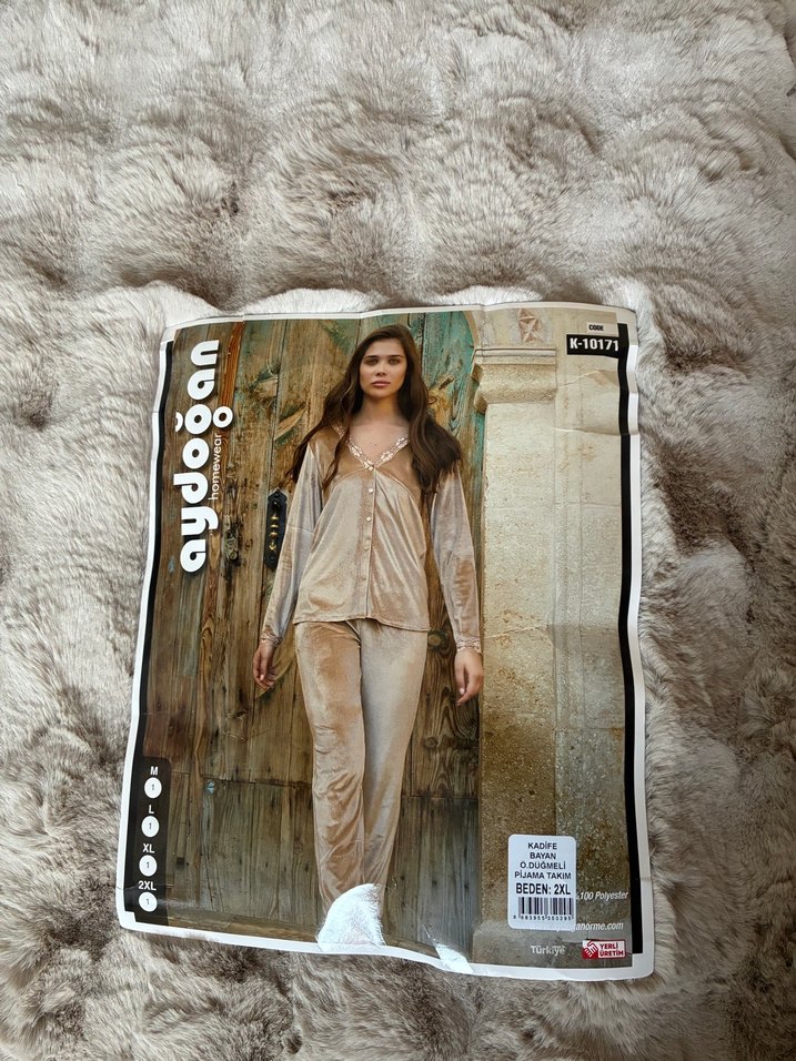 Bol kesim, uzun kollu, bej baskılı kadın pijama takımı, rahat ve konforlu bir uyku için uygun.