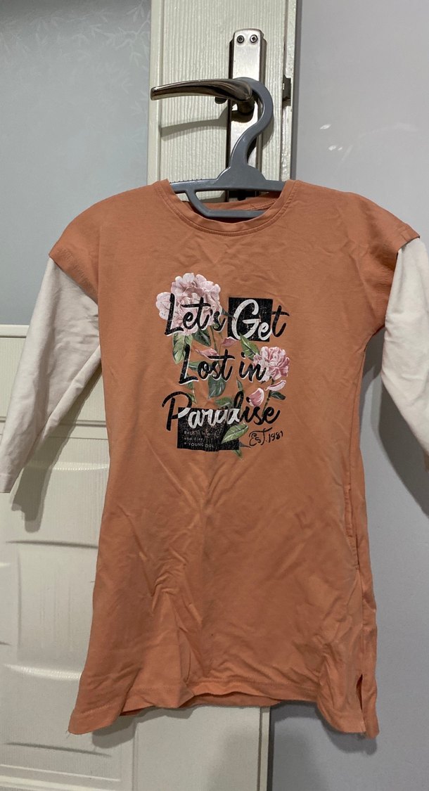 Bej Baskılı Uzun Kollu Kız tişört elbise