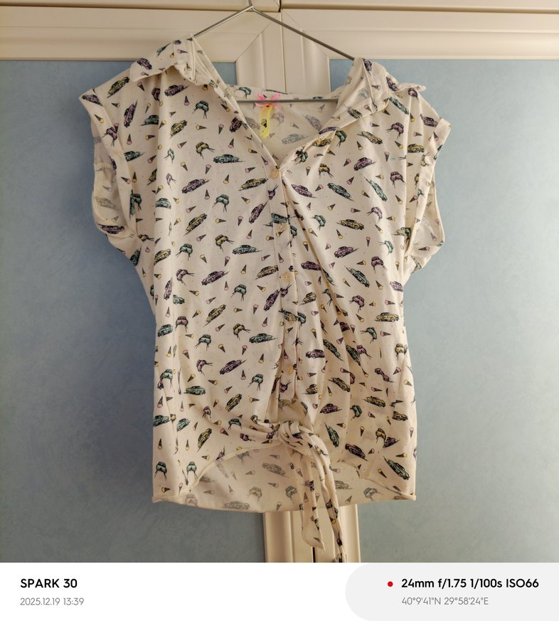 Bej renkte, baskılı ve V yakalı bluz. Kısa kollu, salaş kesim ve drapeli tasarımıyla günlük kullanıma uygundur.