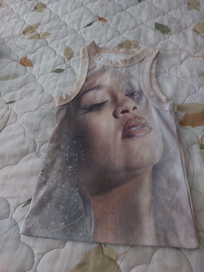 Sentetik kumaştan, bej renkte, baskılı yüz deseniyle yüksek yakalı ve drapeli kadın crop İnce kesim ve kolsuz, günlük sokak stili için uygun. Rihanna baskılı