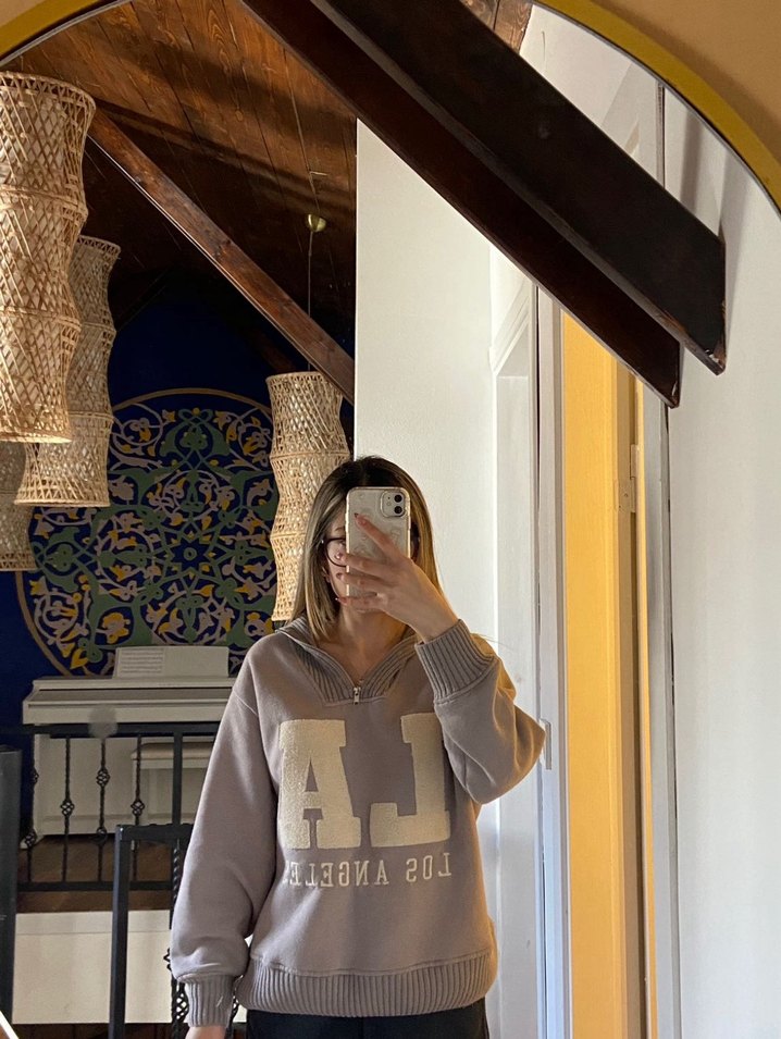 Bej renkli, yüksek yakalı ve uzun kollu örme sweatshirt. Üzerinde 'L.A Los Angeles' baskısı bulunur. Rahat kesim ve midi boyda, günlük kullanıma uygun.