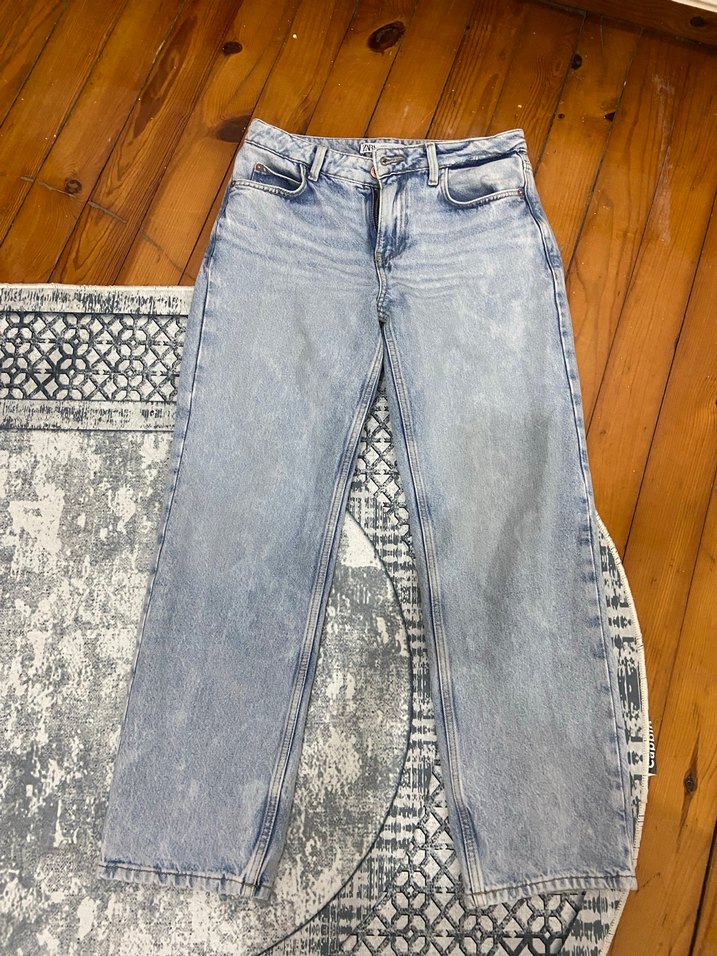 Bej renkte, gri batik desenli bol kesim kadın kot pantolon. Midi boyda, rahat ve şık bir günlük stil için ideal.