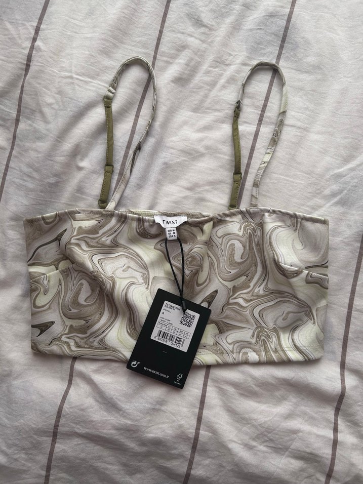 Bej renkli, ince askılı ve tokalı, batik desenli, sokak modası tarzında kadın üstü. Günlük kullanıma uygun, vücuda oturan kesim.
