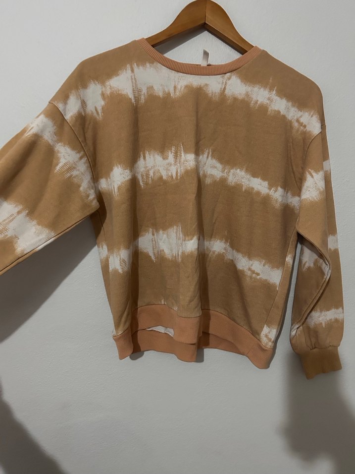 Bej batik desenli sweatshirt, uzun kollu ve yuvarlak yakalıdır. Pamuk kumaştan üretilmiş, bol kesim ve bohem tarz sunar, günlük kullanım için uygundur. Sadece kolunda ufak bir lekesi mevcut