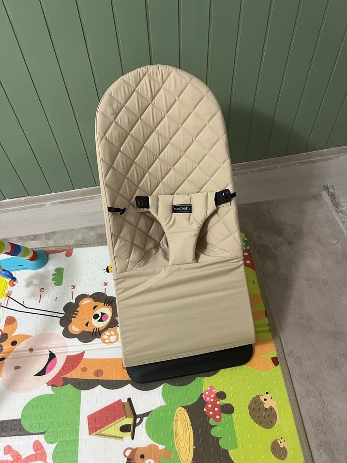 Bej renkte, ayarlanabilir kayışlı ve yastıklı destekli bebek taşıma askısı. Hafif kullanım için uygundur.