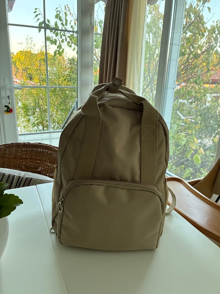 Keten kanvas kumaştan yapılmış, fermuarlı ön cepli bej sırt çantası bebek arabası için takma aparatı var içinde sıvı geçirmez ve ısı yalıtımlı bir çok gözü açar. Tamamen açılır olması eşyalara ulaşımı kolaylaştırır. Çok az kullandık.