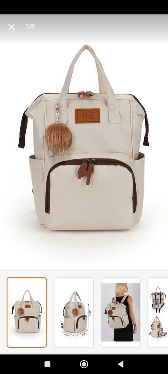Bej renkli, çok bölmeli ve kulplu bebek bakım çantası düzenli saklama sağlar.