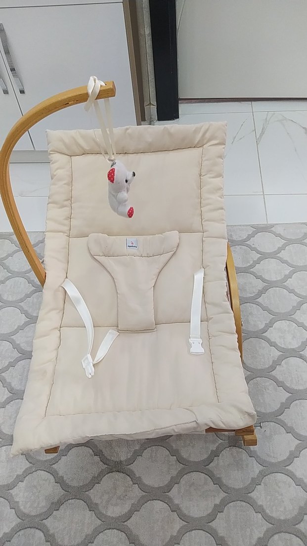 Yumuşak dolgulu kumaşa sahip bej bebek beşiği, güvenlik kayışları ve asılı peluş oyuncakla rahatlık sağlar. markası EgeBaby
