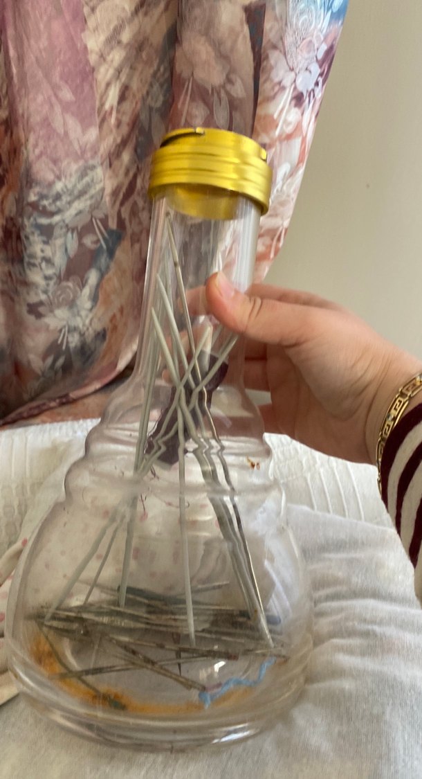 Altın kapaklı, şeffaf gövdeli bej tonlarında bebek biberonu. Beslenme için uygundur.