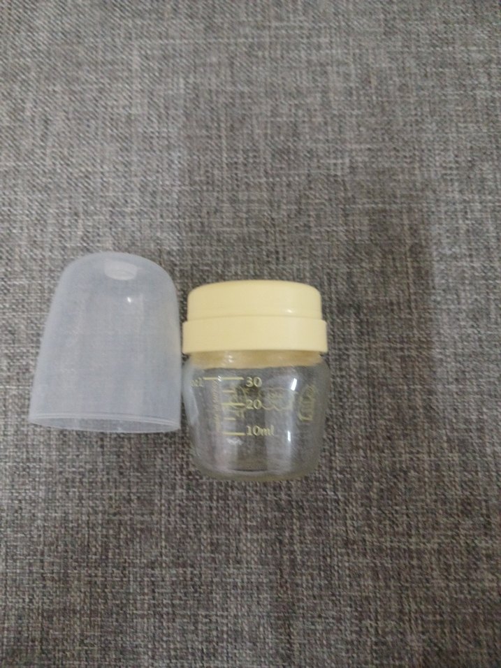 Bej renkli, üzerinde 30 ml'ye kadar ölçü işaretleri bulunan bebek biberonu ve gri koruyucu kapağı. memesi hijyen açısından atıldı