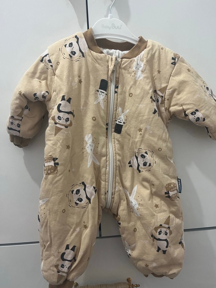 Yumuşak polar kumaştan yapılmış bej bebek erkek tulumu, ön fermuar ve düğme detaylarına sahiptir. Oyuncu panda desenleri ve rahat kesimi bulunur. ❄️ 2 .5 tog dışarda da kullanılabilir az kullandık 80 cm