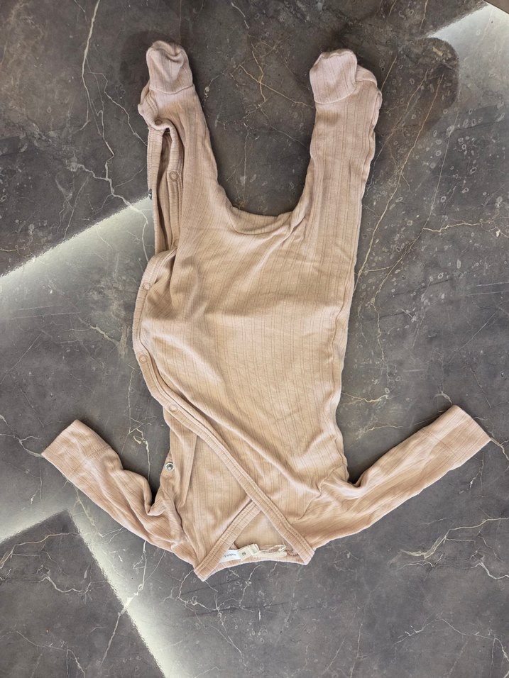 Uzun kollu, yumuşak kumaştan yapılmış bej bebek iç zıbınıdır. Pastel rengi çocuklar için hafif bir görünüm sunar. MarMar Copenhagen marka
