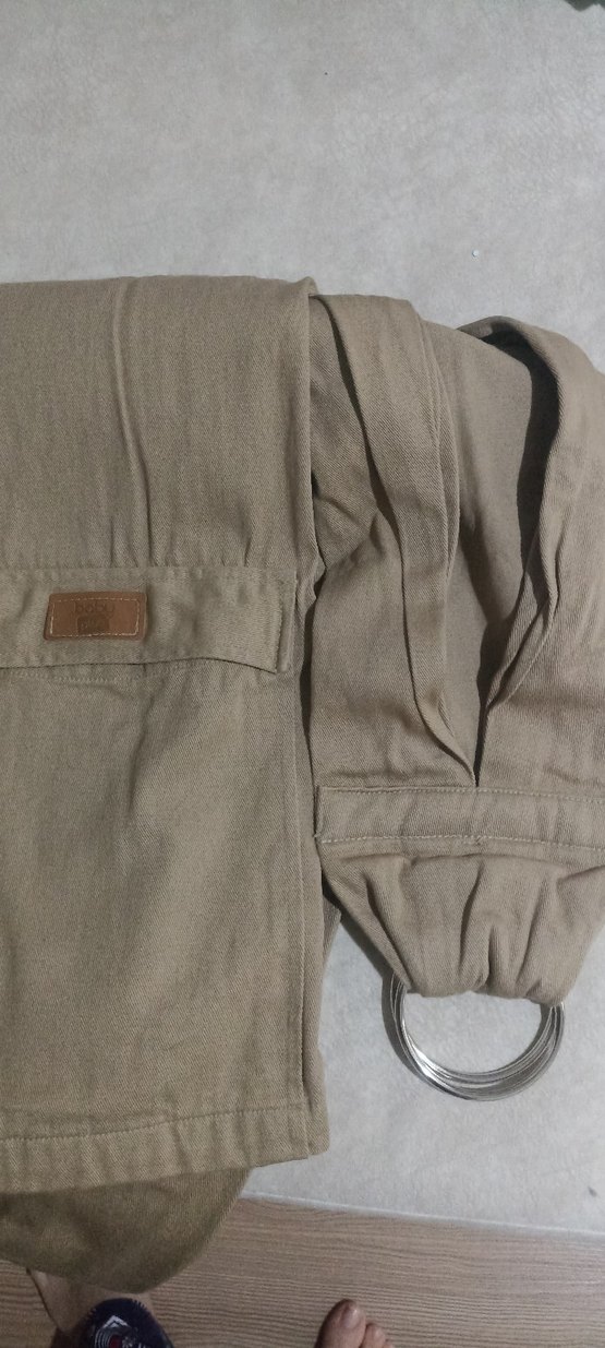 Bej ve gri tonlarında, ayarlanabilir metal halkalara sahip bebek kanguru sling. Yumuşak ve rahat kumaşla bebek taşıma sağlar.
