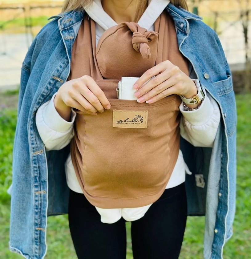 Yumuşak kumaştan, rahat bebek taşıma için bej renkli bebek kanguru sling. Ön kısmında küçük eşyalar için cep bulunur. Bebek şapkası hediye. #sling #bebekkanguru #kanguru