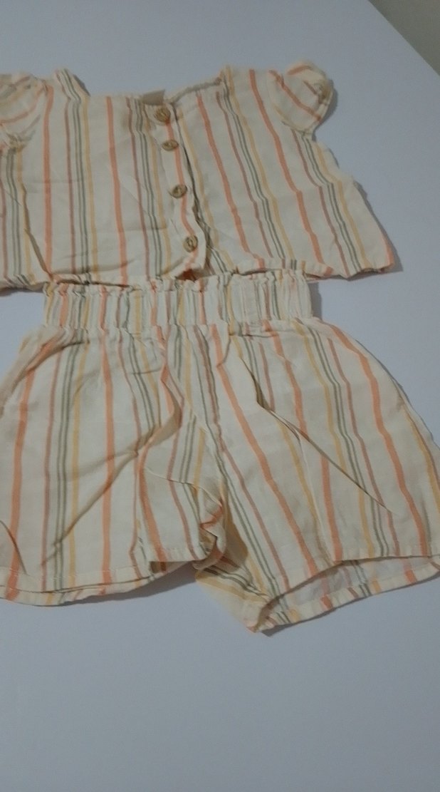 Bej renkte, bağlama desenli, düğmeli üst ve lastikli şortlu bebek kız takımı.