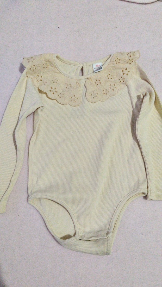 Bej renkte, yakalı ve uzun kollu bebek kız body. Üst kısmında zarif dantel detayı bulunur. Çıt çıtlı zıbın. 18_24 ay
