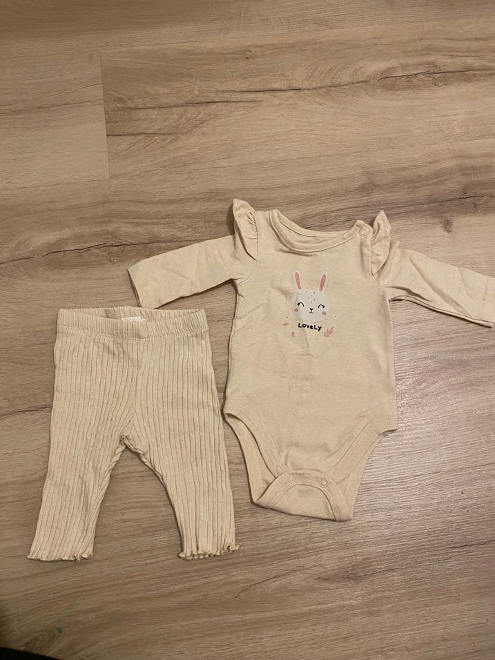 Bej renkli, örgü uzun kollu tulum ve kaburga desenli pantolondan oluşan bebek kız takımı. Yumuşak ve rahat kumaşlıdır. Bebeğime biraz küçük geldi bir kez giydirebildim pantolon rahat fakat zıbını giydirmek zor oldu tekrar giydirmedim bebeğinizin kilosuna göre alın kolundu ufak bir leke var
