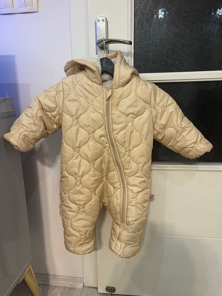 Açık bej renkte, şişme bebek kız tulumu. Kapüşonlu, yakası notched lapel ve önden fermuarlıdır. Soğuk havalar için uygundur. ❄️