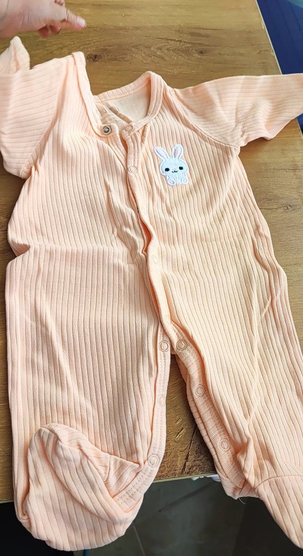 Düğmeli, i, pastel tonlarda, yumuşak dokulu bebek kız tulumu, küçük tavşan aplikesiyle.