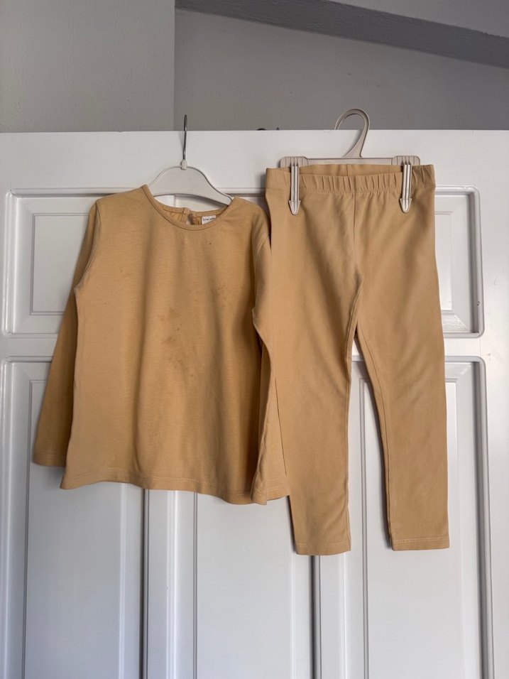 Bej renkte, uzun kollu üst ve uyumlu pantolondan oluşan bebek kız takımı. Düz ve pastel tonlarda, zahmetsiz şıklık sunar.