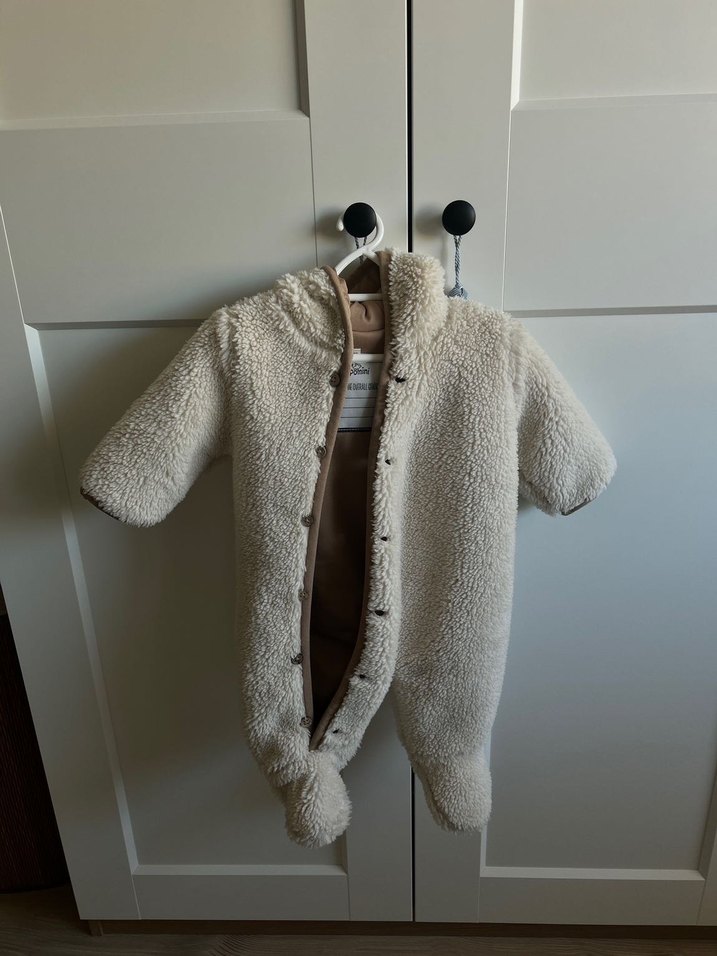 Yumuşak ve sıcak kumaşlı, kürklü detaylara sahip bej bebek tulumu, desensiz sade tasarımda. Sıfır gibi. Zaten 3 defa giyindi Almanya’dan almıştık