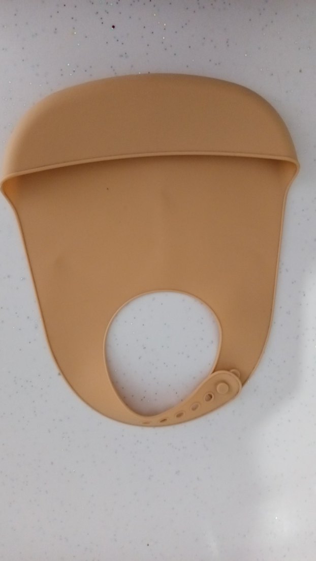 Açılabilir çıtçıt kapamalı, düz yüzeyli açık bej bebek önlüğü. Sızıntıları kolayca. yakalar. Birkaç defa kullanıldı. yeni gibi