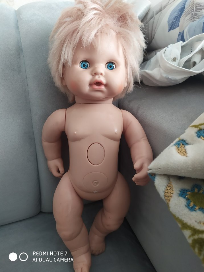 Pastel bej renkte, mavi gözlü gerçekçi özelliklere sahip oyuncak bebek. Pürüzsüz malzemeden yapılmıştır.